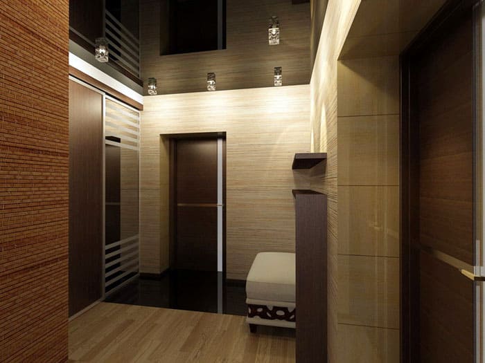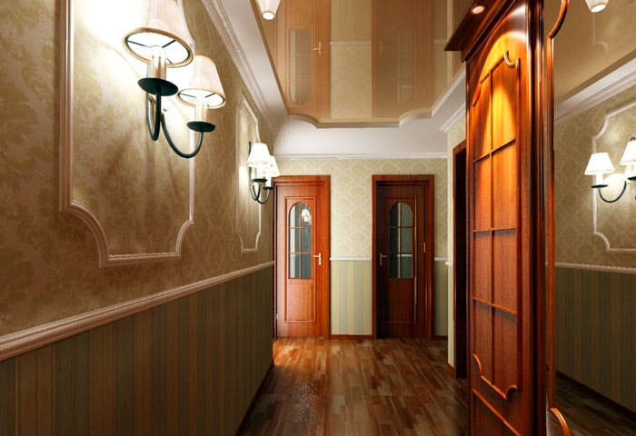 The average hallway is usually small, so you rarely see a multi-level structure in it. It is ideal to install a white, cream, beige gloss in this room. If the hallway looks like a corridor, then you can come up with a two-level structure, and make the gloss insert contrasting or in the same color scheme.