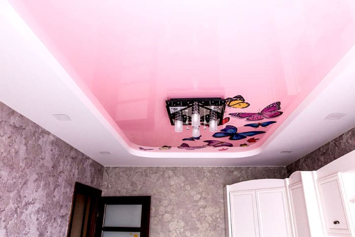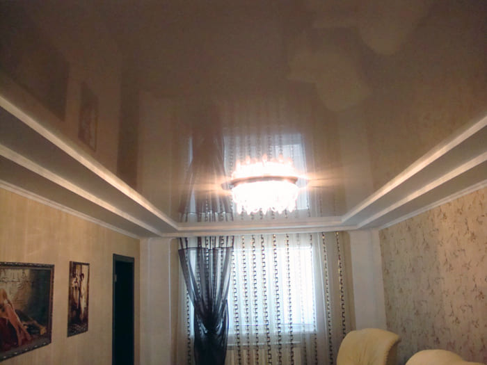 It is not necessary to omit the minuses: if there is a connection of two glossy canvases, then the seam line will not hide from the eyes. The cost of installing the product is high, and if there are several levels, the price will increase even more.