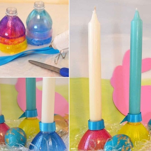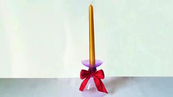 To make such a candlestick with your own hands for tall candles, take two plastic bottles. In one, the neck is cut off less, in the second more. Two necks are connected to each other with hot glue, then the craft is set on a wide base, and a candle is inserted into the narrow one. One beautiful bow, and you can admire the product!