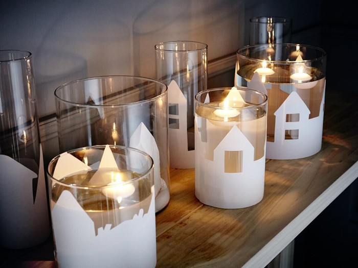 Such a beautiful design will turn out if you use a stencil (any thematic vytynanka will do) and a jar. We measure the girth of the can, transfer the size to paper, make a vytynanka and cut it out. With the resulting stencil, we grasp the jar and glue the edges of the paper. Pour water inside and lower the candles
