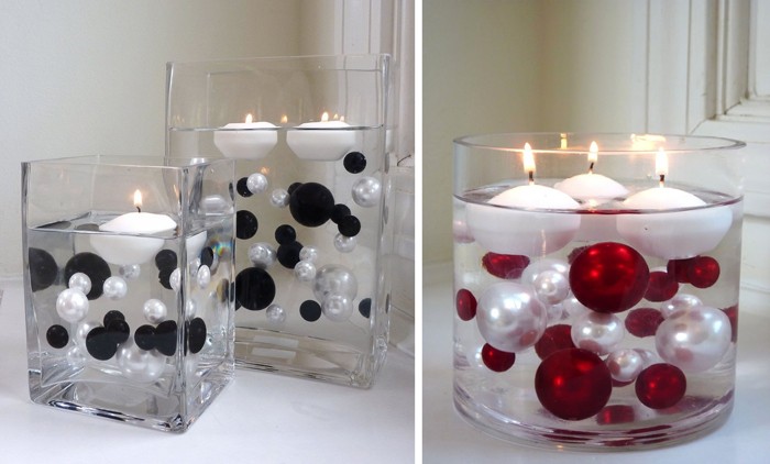 Another striking solution: we put a lot of Christmas balls in the water. If you add a large amount of glycerin to it, then the balls will begin to hang, as if in the air.