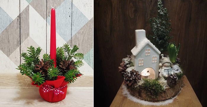 We stick a candle and branches into a pot with earth, and decorate the pot with a felt red cloth. Or we use a ready-made candlestick-house, and take needles as an element of decor