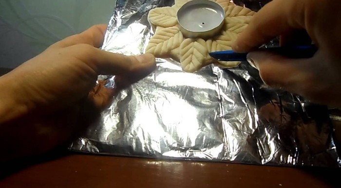 For a flat model, roll out the dough, place a candle in the center and decorate the space around it. Then the product dries up and needs to be painted