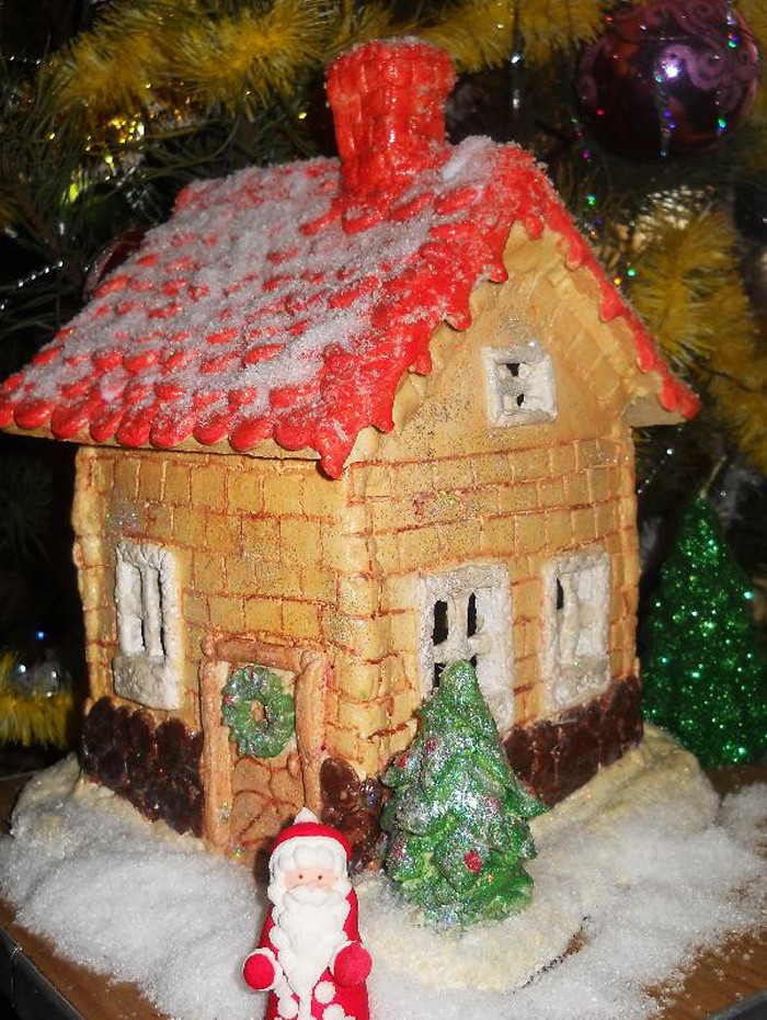 First, the dough is rolled out to a thickness of 0.8-1 cm, then the shape of each wall is cut out on it according to the scheme or template. On each wall and roof, bricks, doors are formed manually with the help of improvised means, windows are cut through. In the roof, they must leave a place for smoke to escape or make a chimney separately, and then attach it to the roof. As soon as the components are dry, they are collected together and glued with Titan glue or paste-like glue. You can first coat the joints with dough, thereby not disturbing the "laying" of the brick. The painting stage remains.
