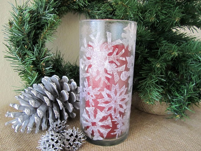 It is not difficult to cut snowflakes from napkins and glue them onto a glass with soapy water. It is good to use PVA glue instead of soap, but it will be more difficult to wash it off.