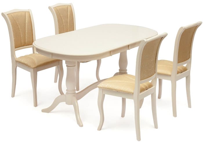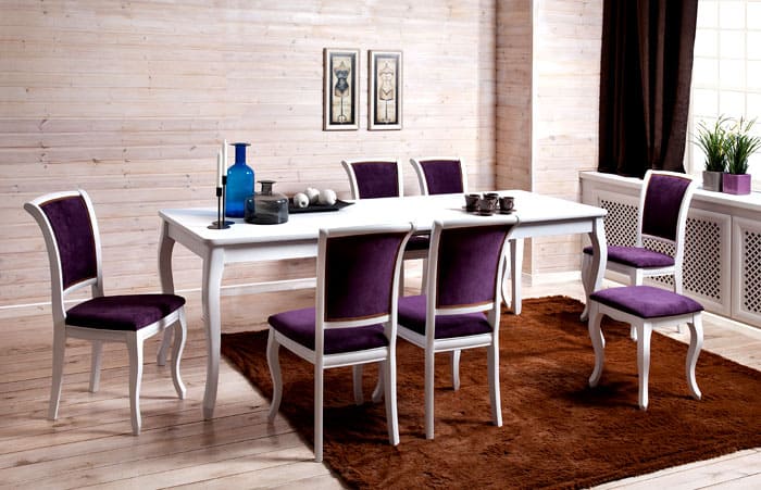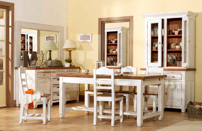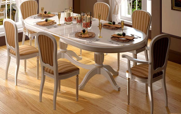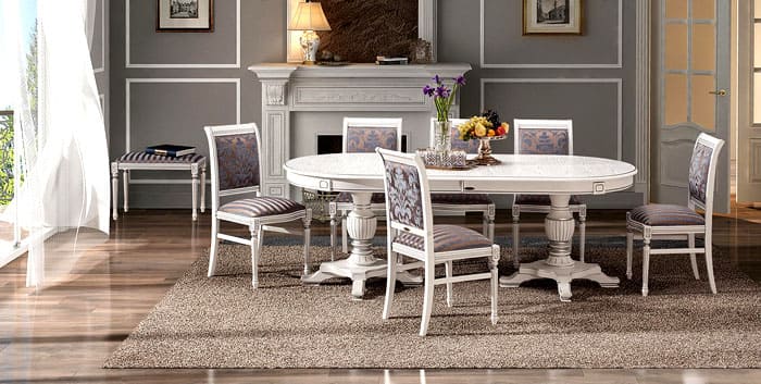 For romantic trends and furniture, they select elegant, with smooth outlines, in light colors. Provence dining groups and shabby chic will be distinguished by light shades, carved elements, abrasions, perhaps the presence of an ornament.