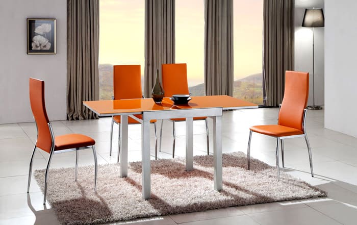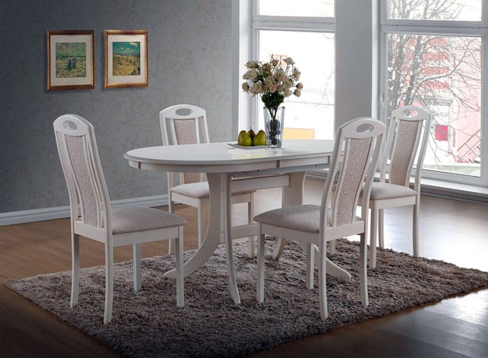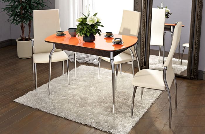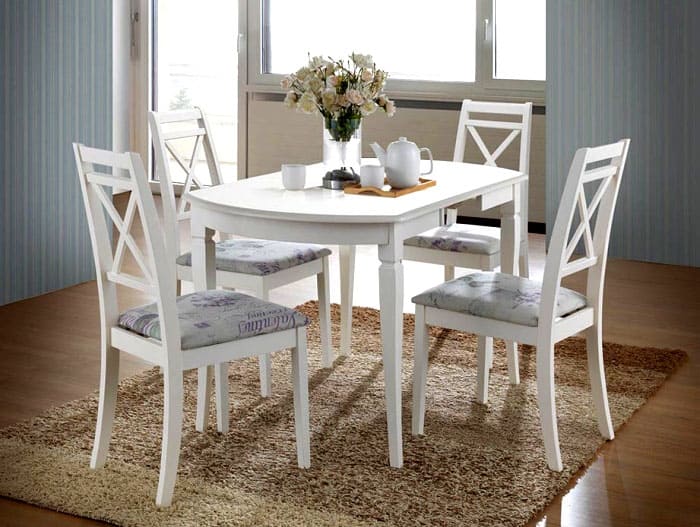 The small dimensions of the room sometimes severely limit the choice, but, nevertheless, it is still there. Before buying, we measure the area that can be taken under a table with chairs, and we are guided by the obtained values.