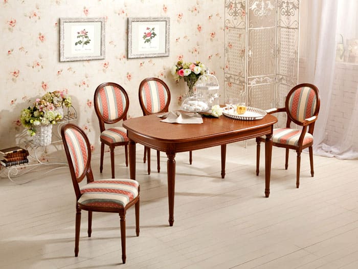 The set includes a table and 4 chairs of a strict classical form. Wood and fabric upholstery complement each other perfectly.