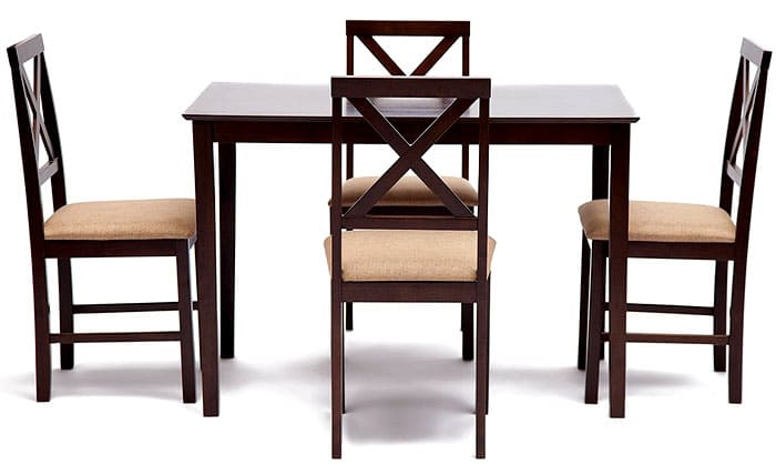 The Malaysian dining group with a table and four chairs is also made of hevea. Furniture is based on MDF and veneer, fabric upholstery.