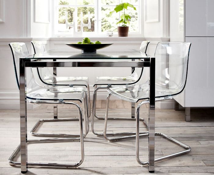 Glass is usually an example of contemporary stylistic trends. The material is called red-hot triplex - you should not worry about the strength of the dining group, it is not inferior to metal.