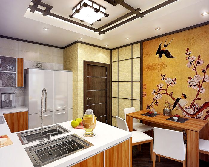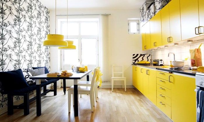 Such tones will give a small kitchen a visual volume, fill it with air and light. It is advisable to choose the panels of the kitchen set in light shades. Do not be afraid that they are too easily soiled, washable or non-woven wallpaper can be easily cleaned with a damp sponge.