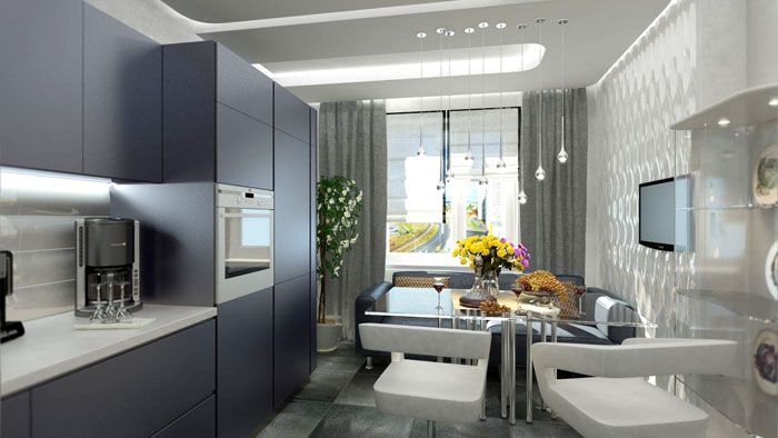 This direction is characterized by cold shades in blue-gray-blue tones. This is the style of practical people. Canvases can be with a relief texture. You can glue strips for painting or glass wallpaper. Our small photo catalog of high-tech interiors will help you choose wallpaper for this kitchen.