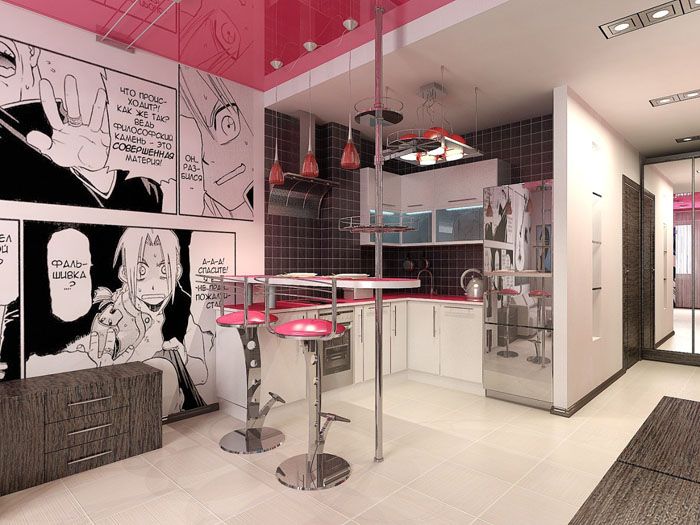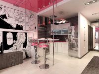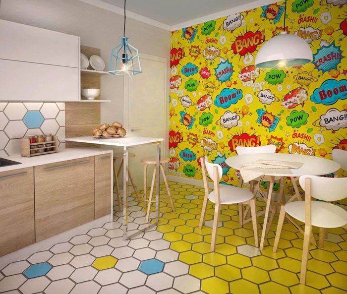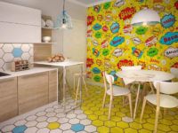 This trend is characterized by a play of colors, elements that complement each other, uniting into a single picture. You can choose wallpapers with hamburger collages or graphic-style celebrity photos. It must be remembered that an excess of accents will negatively affect the perception of the kitchen. It is better to decorate one wall colorfully, glue the rest with plain light wallpaper.