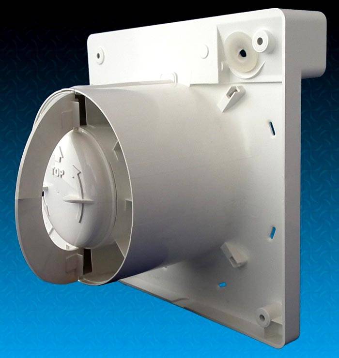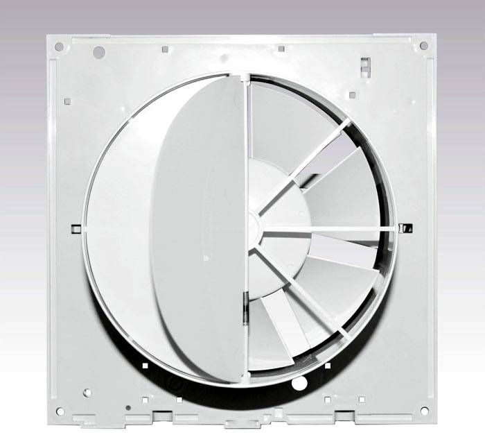 IN this design petals are pressed by built-in springs.The parameters of these return mechanisms are calculated at the design stage. They correspond to the performance of the equipment (force of air flow). If it becomes necessary to replace a broken part, a new spring is selected with similar characteristics. This design with a large number of plastic elements is well suited for bathrooms. However, it is useful to check the manufacturer's recommendations, the protection class of the electrical device, taking into account the high humidity in the room.