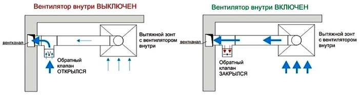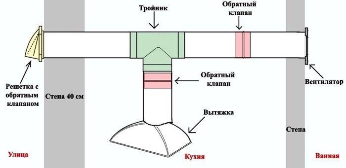 The use of a tee for the exhaust hood with a check valve prevents the flow of air from the duct into the kitchen. Another device performs similar functions. It can be installed differently from the picture, but in combination with a fan.