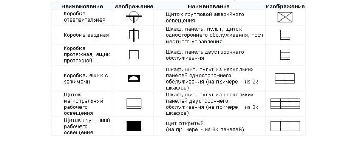 All elements of the power supply system are displayed on the diagram in the form of graphic images, which are regulated by the regulatory literature indicated in the previous section of the article. Electrical boxes and cabinets for various purposes are depicted as follows.