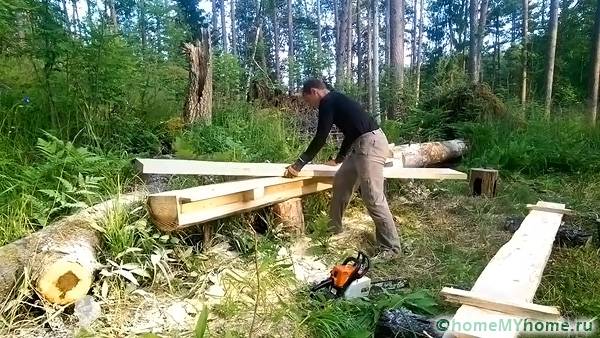 In accordance with the drawing, on the ground we cut wooden beams 150x150 mm to the required dimensions before lifting them to the roof. Then, be sure to treat them with antiseptics and apply a protective layer. If this is not done, then insects or other pests may start in the wood, which will destroy the strength of the structure and will have to be replaced.