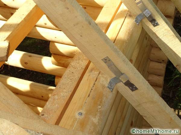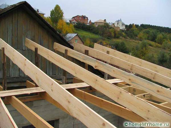 - Rafter system. Designed to absorb the main load of the roof and its uniform distribution along the entire area of the walls of the object. Usually it is made of wooden beams with a cross section of 50x100 mm, depending on the roof area and the number of supporting elements.