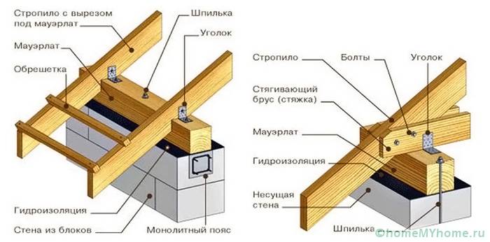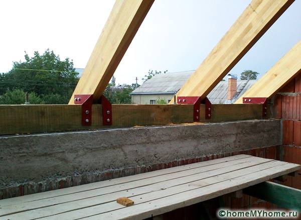 We install the prepared beams on a wooden strapping or Mauerlat with fastening "in a paw", "in a bowl" or on steel pins. For the first two options, you will need to make the appropriate cuts of the Mauerlat and rafters at their points of contact. To do this, mark the point of contact with a marker, and then saw off the corner with a saw to a depth of no more than 30% of the height of the rafter. Additionally, it is necessary to install special steel brackets to increase the strength of the rafters or anchor.