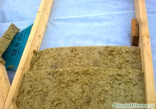 At the next stage, the insulation material is laid. Step by step, performing the installation of a shed roof with your own hands, it is recommended to use mineral wool materials, expanded polystyrene or polystyrene as insulation. An important point when laying them is to ensure tight contact with the rafters without the slightest gap.A slit with dimensions of 1 mm and a length of 10 cm is capable of providing heat loss of several kilowatts, depending on the ambient temperature.