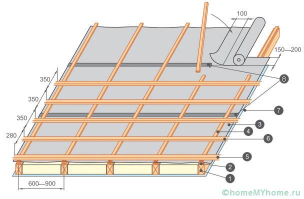 1 - rafter; 2 - counter rail; 3 - waterproofing film; 4 - vertical crate; 5 - horizontal purlins; 7 - vapor barrier film; 8 - waterproofing seam.