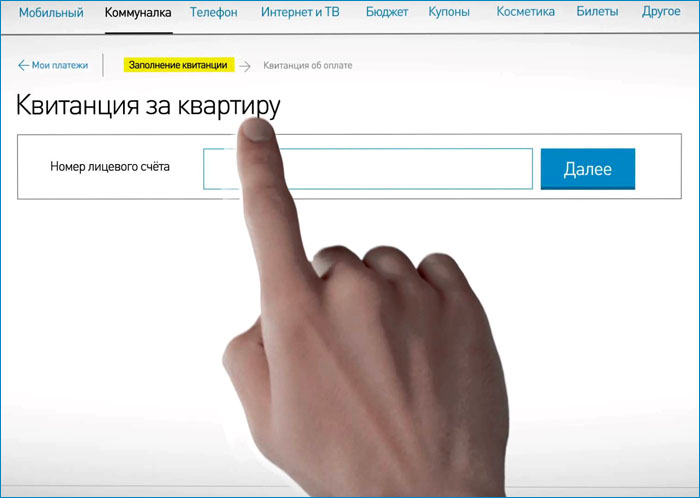 On the monitor, select the "payment" or "payments" button. There is a list of where we could spend our finances. Since we are talking about a communal apartment, we enter information about the location of housing, personal account and amount.