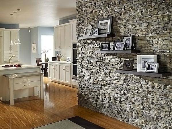 - Artificial stone - combined with wood will help create a noble and elegant interior. Most often, acrylic stone, porcelain stoneware, concrete stone, agglomerates are used in the design of houses. In a dwelling where wood predominates, they should only trim part of the wall and elements fireplace (if he is).