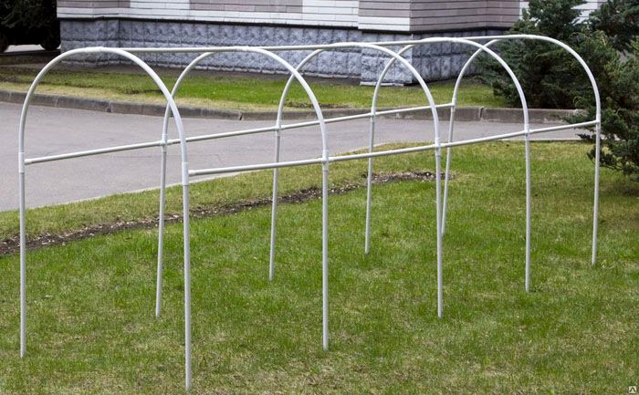 The pipes can be easily bent and inserted into the fittings near the ground. To secure the structure with high quality, use a perforated tape. The arcs can be skewed a little, but to correct this temporary defect, a tie is made of several long pipes, which is attached to the arcs with wire.