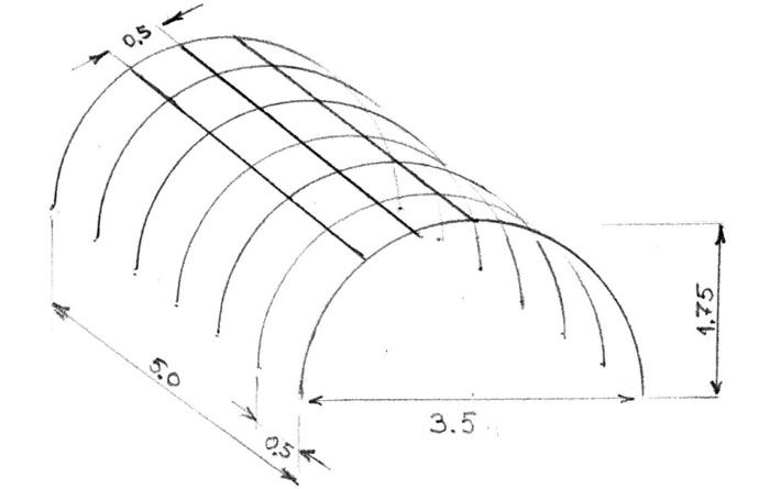 - The foundation laying consists of digging a trench 0.5 m deep and 2 m wide. The length of the trench is the same as the length of the greenhouse.