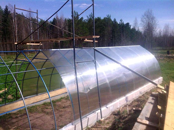First, they close the ends of the greenhouse and make a door. Then they begin to lay and attach the sheets on each side of the greenhouse.The work of making a polycarbonate borage greenhouse is not difficult and will hardly take more than one day, especially if there are helpers.