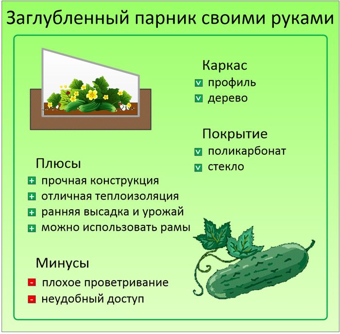 Not everyone is familiar with a buried greenhouse for growing cucumbers. This is an easy-to-use greenhouse that allows you to please with the earliest harvest.The small size does not allow growing crops on an industrial scale, and inside it is quite crowded. But the high yields of the first crunchy cucumbers are worth it.