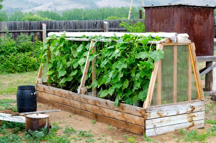 Wooden box and wooden frame with a film stretched from above - large harvests of cucumbers are provided