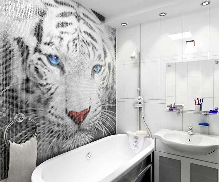 You can successfully accentuate a monochrome mosaic in the form of a strip or pattern. This will play a role in the perception of room proportions.