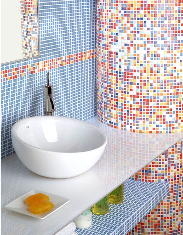 A riot of colors for bathroom decoration is also welcome. You can use both mixes and alternation of monophonic zones with colored ones. Let's analyze the general impression that multi-colored mosaic tiles make.
