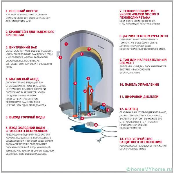 The main distinguishing feature of water heaters of this brand should be called the ability to heat water to a temperature of 55 ° C. Water of this temperature is equally well suited for washing and washing hands, solving other household tasks related to the use of hot water. In addition, the formation of lime deposits is excluded at this temperature, and the energy consumption is low.