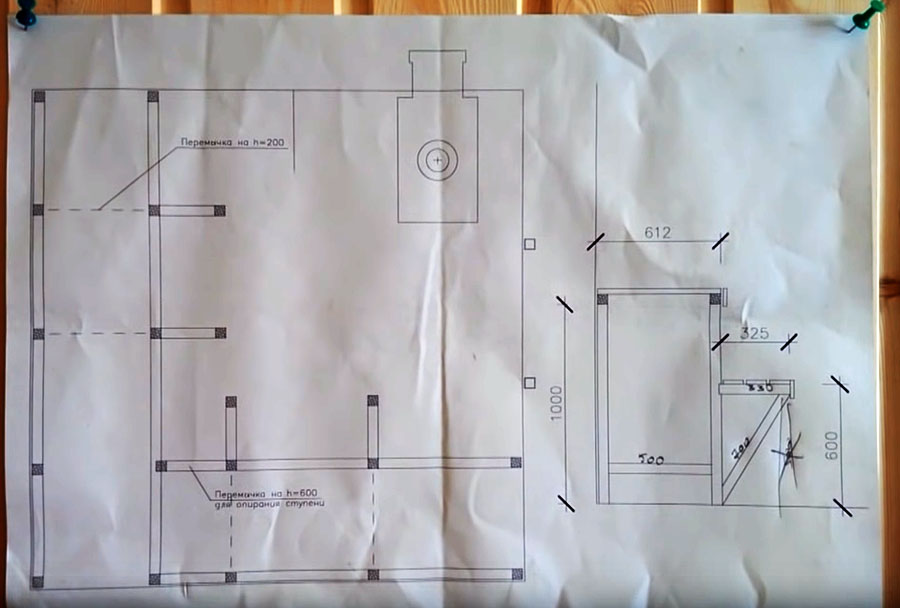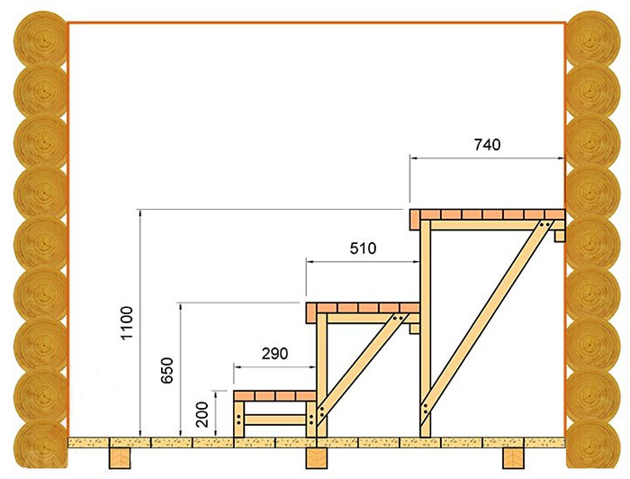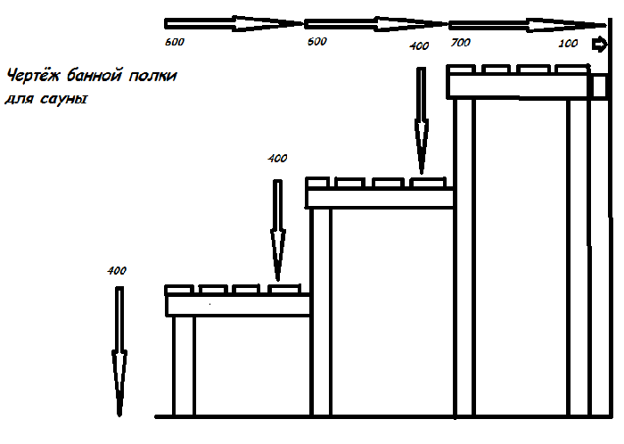 The drawing shows that the frame with shelves will be three levels. It can be equipped both in steam rooms and saunas.