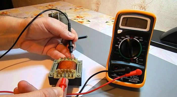 In order to check the health and performance of the step-down transformer, you will need multimeter (tester) - a combined electrical measuring device. If there is no marking on the transformer, then the ends of both windings are initially determined. For this, the tester probes are applied to the lead terminals (wires) of the device under test, while the multimeter is used in resistance measurement mode... When the ends of the windings are marked, it is determined which one is primary and which is secondary. For this, the values of resistances in the windings are studied, in the primary it will be greater, in the secondary - less.