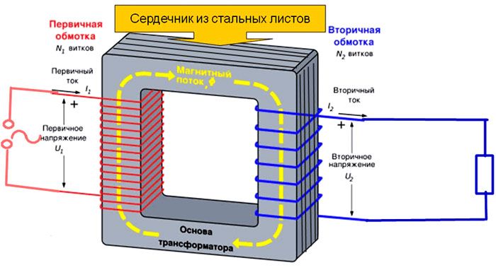 The specified value of the voltage on the secondary winding is created by winding a certain number of turns of wire on the core of the device.