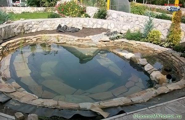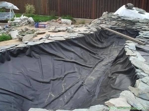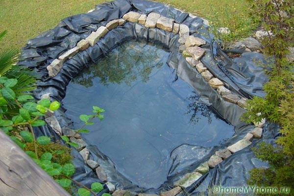 - butyl rubber membrane - the best option for a heavy film for a garden pond, cut in one piece to the size of a pit, fit into an impromptu bowl, run ashore 15 - 20 cm, pressed with stones;