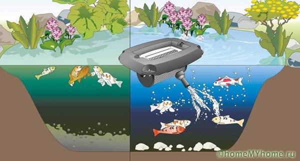 To make a pond with your own hands for fish farming, it is necessary to provide mechanical, biological, chemical cleaning, surface cleaning. Dirt, leaves are removed from the mirror of the reservoir with a net, chemical cleaning is carried out with stabilizing reagents that promote the development of bacteria (UV cleaners).