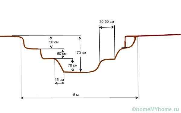 In the pit of the pond for fish farming with your own hands, there should be no tree roots, large boulders. The recommended slope of the walls is 10 - 40 degrees, depending on the type of soil. Terraces facilitate the operation of the reservoir, cleaning the bottom, planting deep plants, are useful for fish. The canvas can be additionally fixed on the shore with steel hooks driven into the ground.