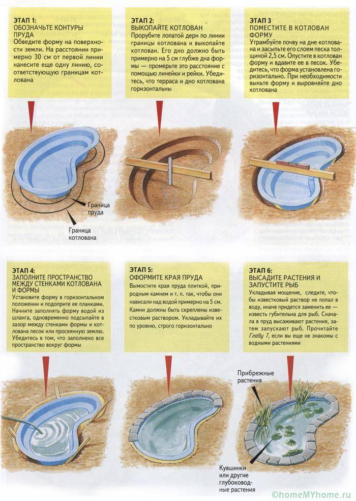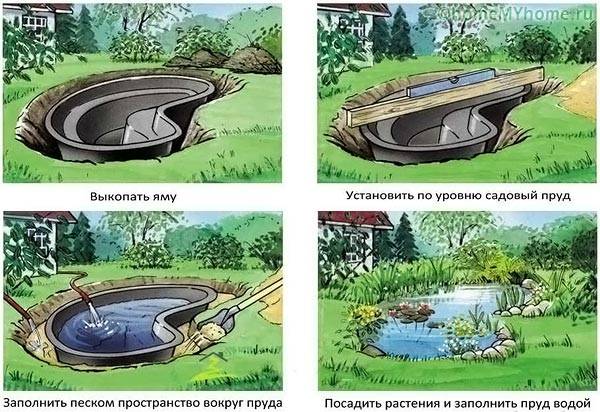 - plastic pond - manufacturers produce bowls from composite, polymer materials, immersed in pits, the profile of which corresponds to the external relief of the container;