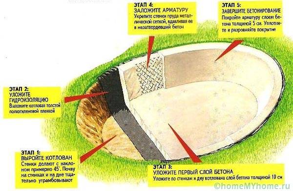 During the concreting of the pond, the bottom is first poured at a depth, then the vertical formwork is installed for one step of the terrace. The outer surface is waterproofed with a film, the inner surface is often coated with polymer primers that are safe for the ecology of the reservoir.