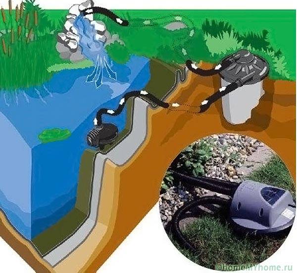 Biological filtration is carried out in a shallow reservoir near the main pond or with a special biofilter inside a technical well of 1 m of well rings. For mechanical cleaning, filtration wells are used by analogy with infiltration systems outdoor septic tanks: