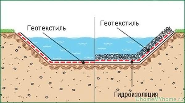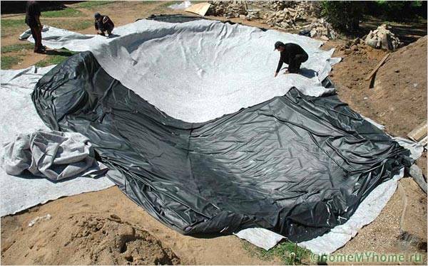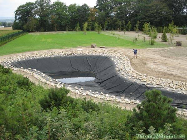 - film reservoir - the relief of the bottom of the pit is covered with membranes that are pressed against by sand, gravel, the reservoir is filled with water, plants are planted, fish are launched;
