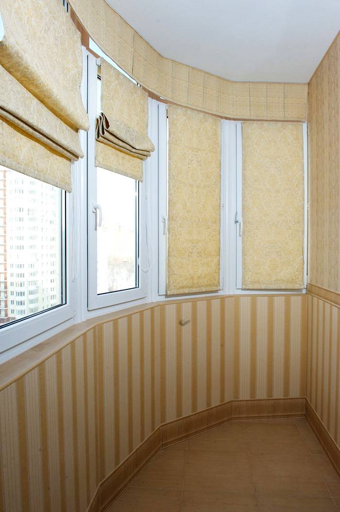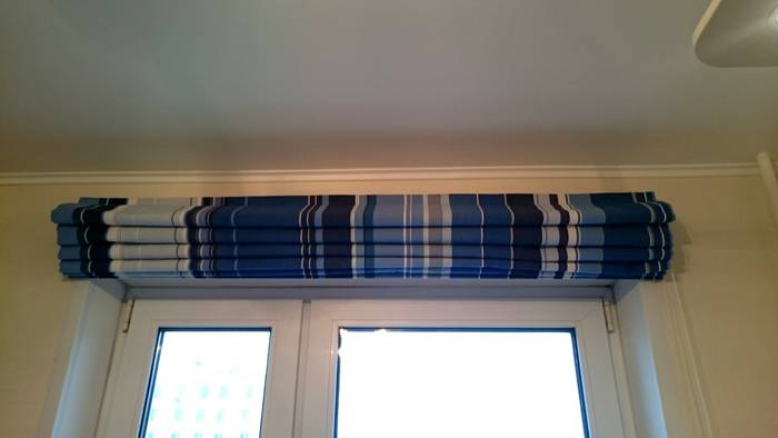 The first option is flat canvases that form horizontal folds when raised. Here are some photo examples of classic Roman curtains for the balcony: