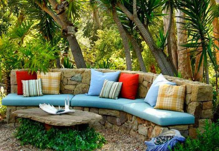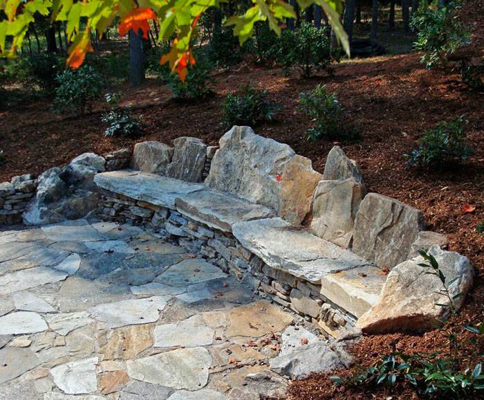 A do-it-yourself garden bench with a back can be made of stone. This material is distinguished by high performance properties, as well as significant strength. Stone structures can be used for any garden style and design. The use of stone elements to complement the overall design. Such furniture looks good against the background of a building with separate stone details.A stone bench will make a wonderful combination with stone beds, steps, ponds and paths. These benches are often combined with wood.