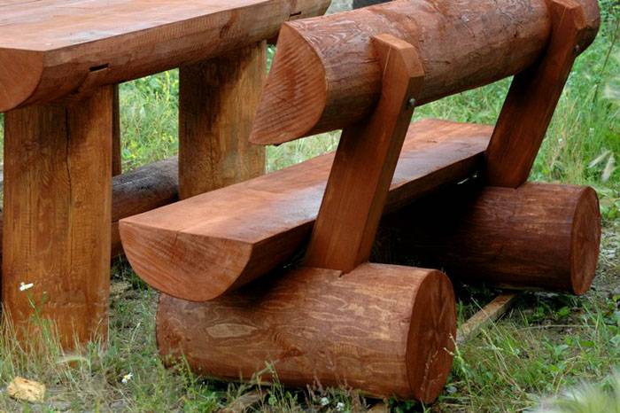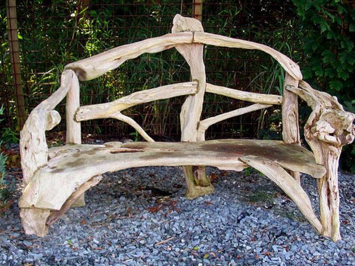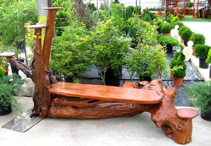 A rustic and ethno-style bench will perfectly fit into the decor of the yard. With its help, you can create a magnificent natural corner. To build such structures, wood is used with or without bark. A variety of curved shapes can be used in the manufacture of benches. Before design, all parts must be sanded and processed.An unedged board is used to create the seat. All construction details are rounded.