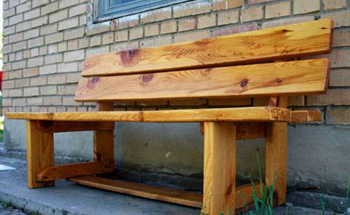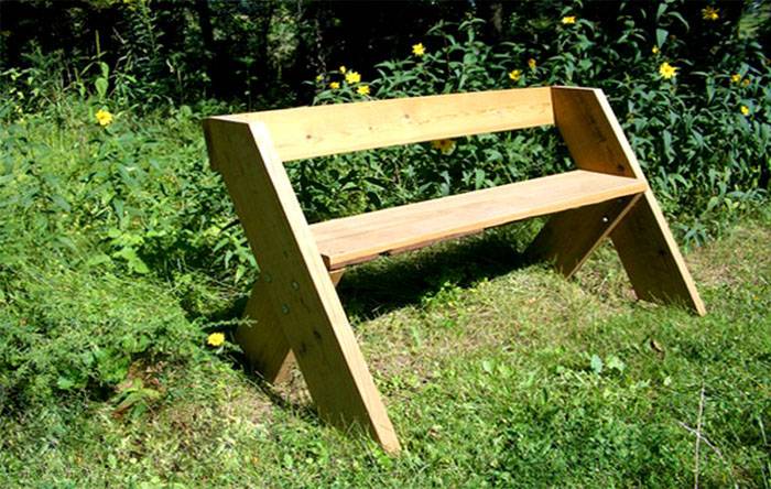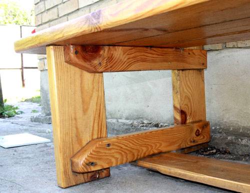 You can also build a simple do-it-yourself bench from wood. In this case, the legs can be in the shape of the letter X. From the boards, you can make a bench in the shape of the letter P. In this case, it is necessary to ensure rigid fixation of the seat and legs.