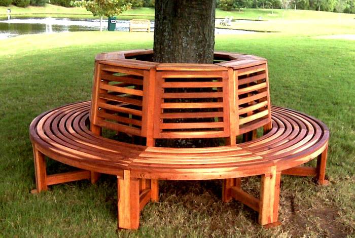 A simple solution is to use two drawers and a couple of boards. In this case, the boxes will be installed as supporting elements. They can be filled with soil and make a beautiful flower bed in them. A seat is mounted from the boards, which is installed between the boxes. Be sure to sand the surface with sandpaper. For a more practical design, the boxes can be replaced with stone or concrete pedestals. Seats can be constructed from log halves or treated boards. You need to fix the seat with metal corners. Dowels are used to attach them to concrete bases. And fixation to the tree can be done using self-tapping screws and through bolts.